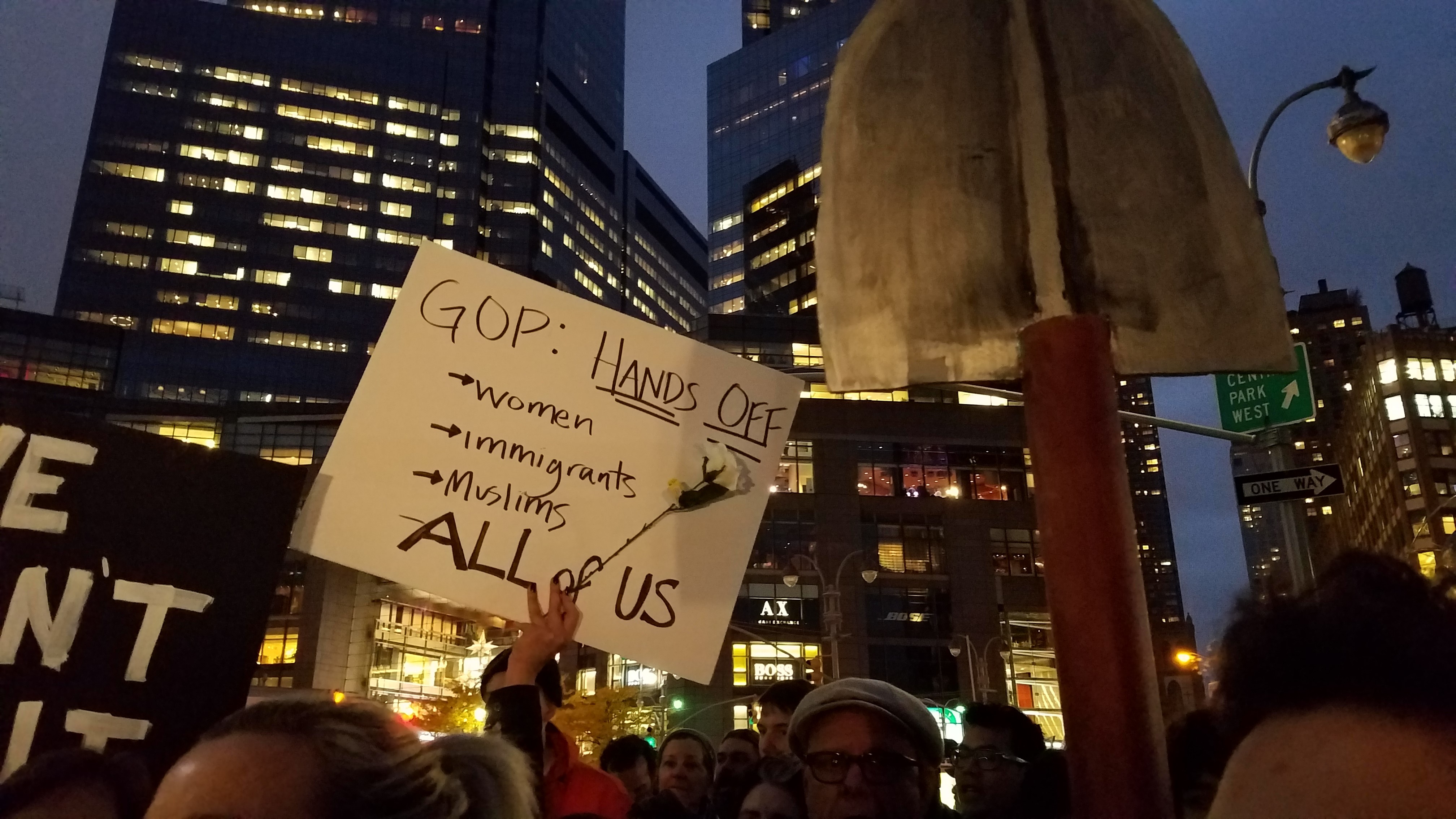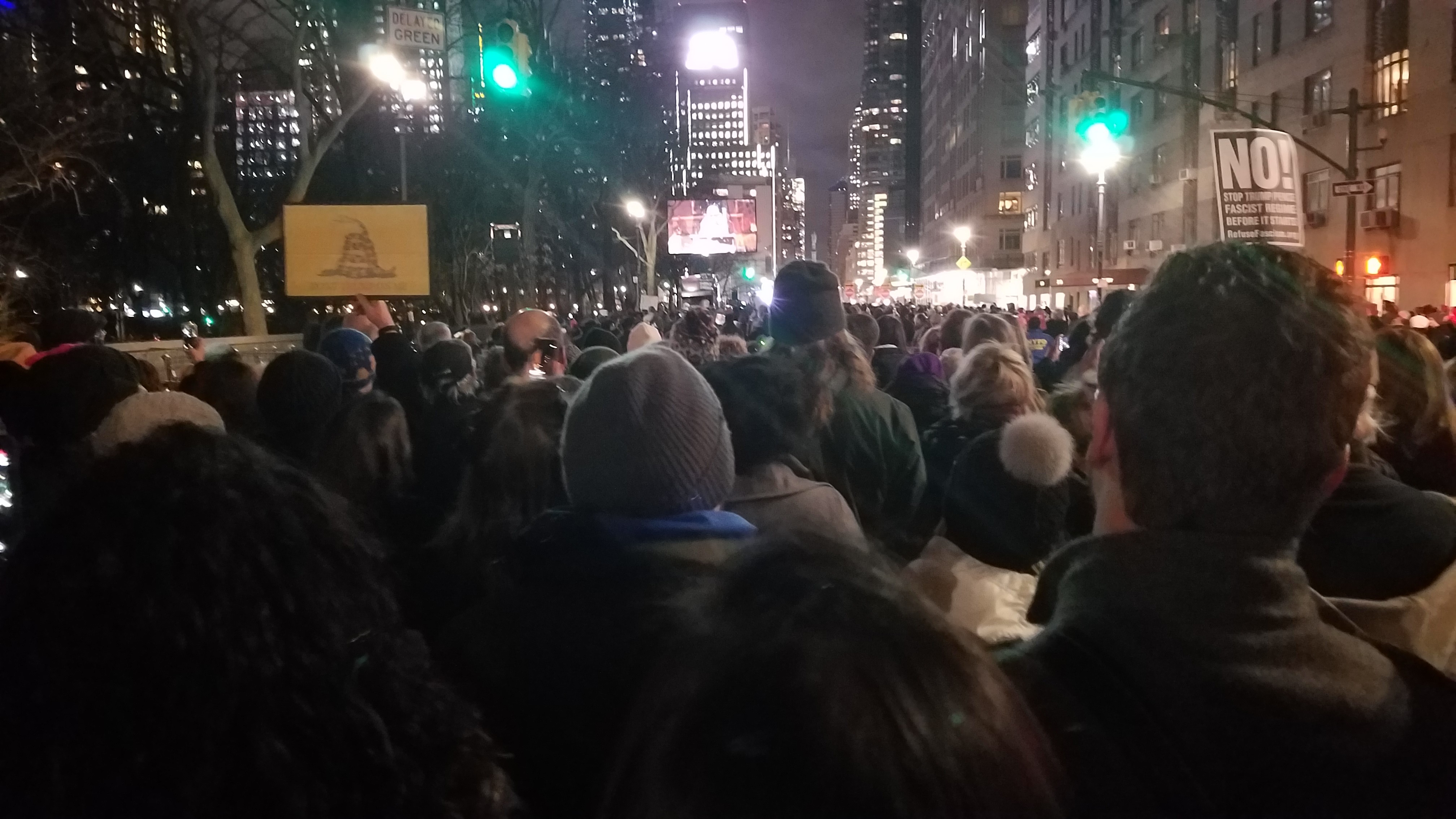 In the immediate lead-up to January’s presidential inauguration on November 20th, I travel once again to Columbus Circle, where a crowd noticeably larger in size and fervent in spirit has assembled to protest the now-imminent dangers a Trump administration would pose to marginalized groups,
